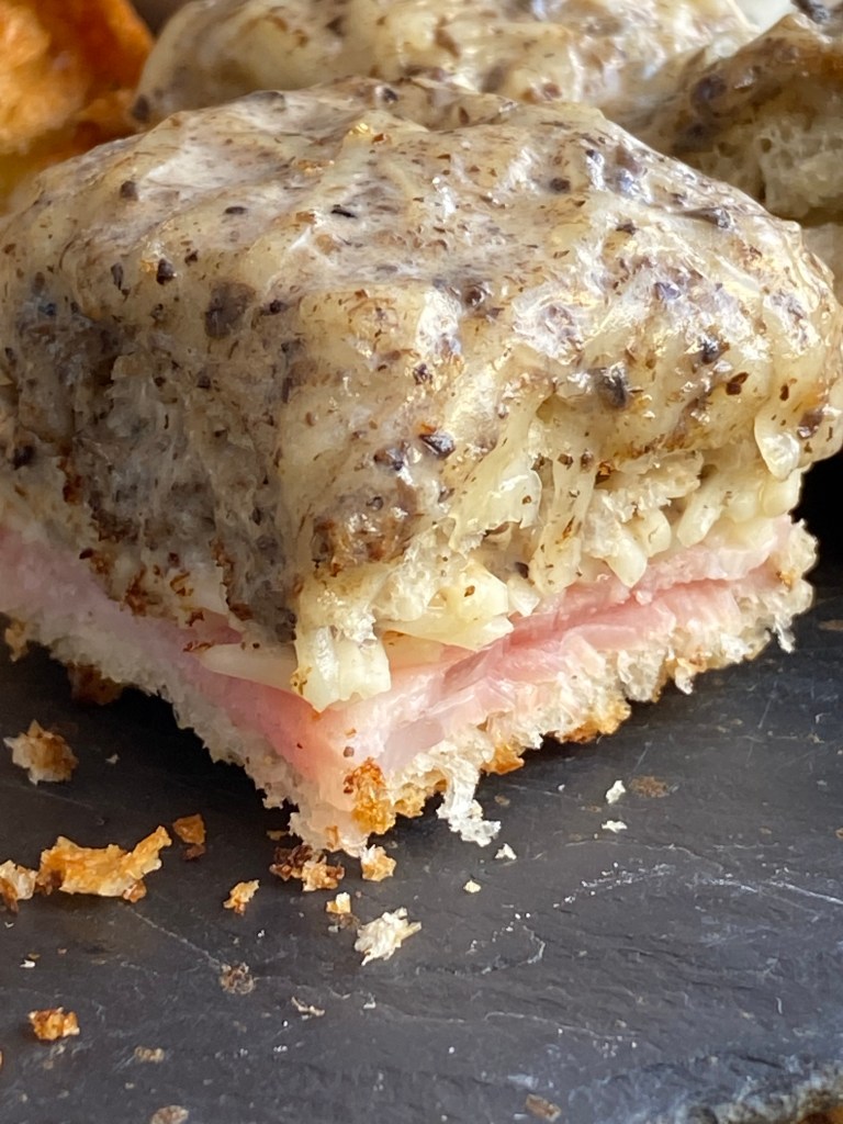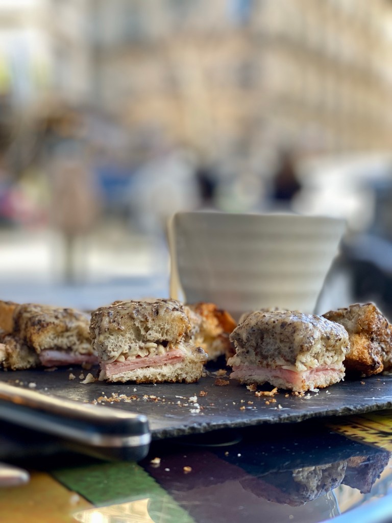 My lunch? Croqué apéro was how it was listed on the menu. (Apéro is happy hour – so it’s served like an appetizer.) What they served me was like mini croque monsieur squares. The thinnest sliced ham — see-through — and cheese, and some sort of truffle sauce on pain grillé and all sliced into neat little squares, served with a knife and fork. I couldn’t possibly finish this, but I couldn’t leave it either.