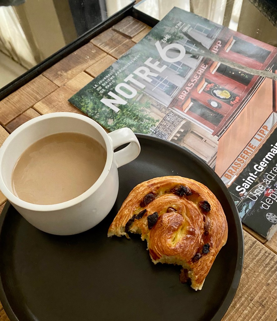 I came home to re-wash the clothes I’d laundered in fabric softener, made some coffee, and enjoyed a « pain aux raisins » with French cartoons playing in the background. Work, work, work. Later, I’m meeting a friend for coffee at a nearby café.