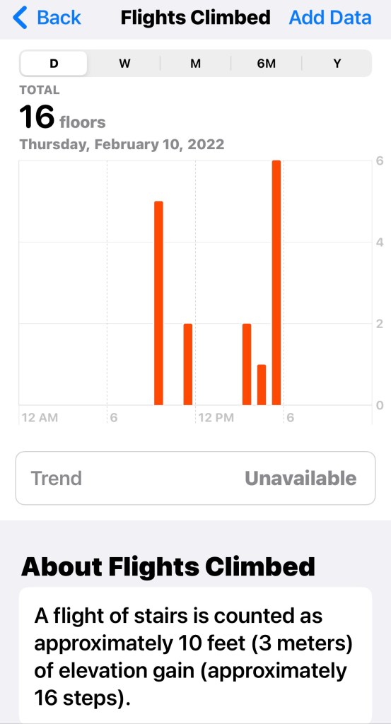 Speaking of stairs, which I know I’ve done often here. I checked my phone app, and was surprised, but not surprised at the numbers I saw. I’m averaging 9 flights a day, but last Thursday (10 février 22) was a record.