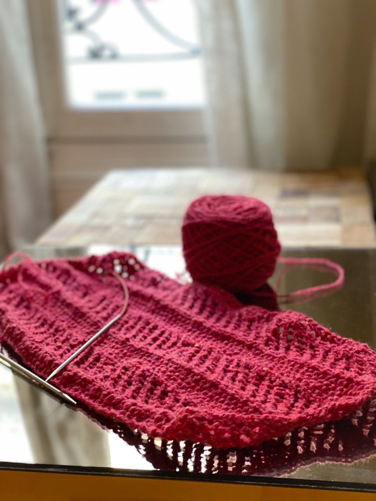 One of those words is tricoter, a regular “ER” verb meaning: to knit. I actually packed a small knitting project I’d started at home. I’m using a lovely yarn in a deep rose color. It has a slight tweedy look and is a blend of merino wool (la laine), cashmere (le cashmire), and silk (la soie) to make a lacy scarf (l’écharpe) for myself. So far, in 3 weeks, I’ve knitted exactly one row. That’s how busy I’ve been. At this rate, it’ll be summer by the time I finish.
