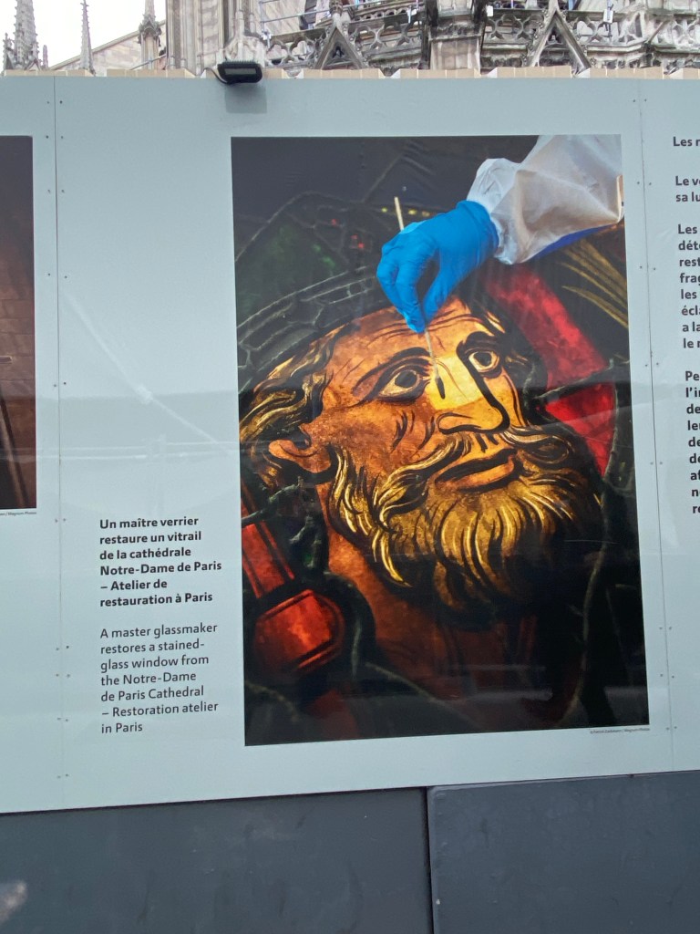 La Cathédrale Notre-Dame is still undergoing reconstruction after the devastating fire in 2019. It is not yet open, and is temporarily surrounded/fenced in by large sheets of painted plywood. You can look up and see some of the horrific damage. But there are large photographs affixed to this plywood fence showing the fire, the damage, and the meticulous restoration process. Their intent is to restore the Cathédrale to the way it always was, bien sûr, and this decision was unanimous by those involved. Seriously, the people of Paris wouldn’t stand for anything else. As I understand it, they hope to re-open in 2024, my guess is, in time for Paris to host the summer Olympics.