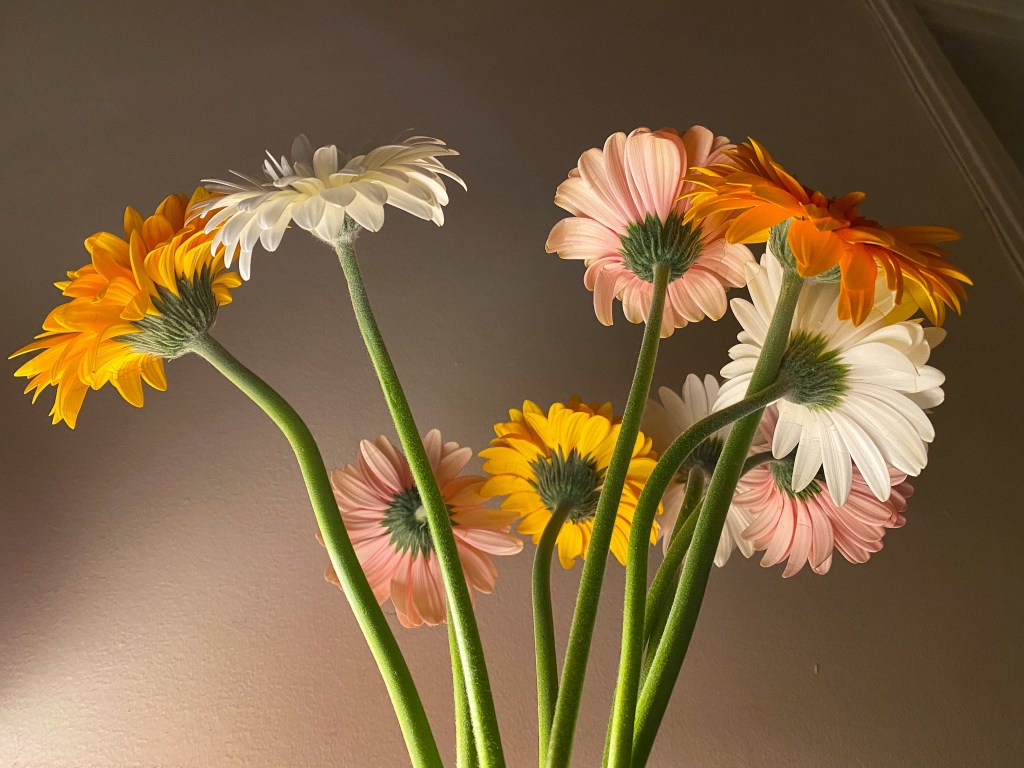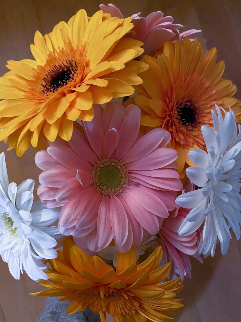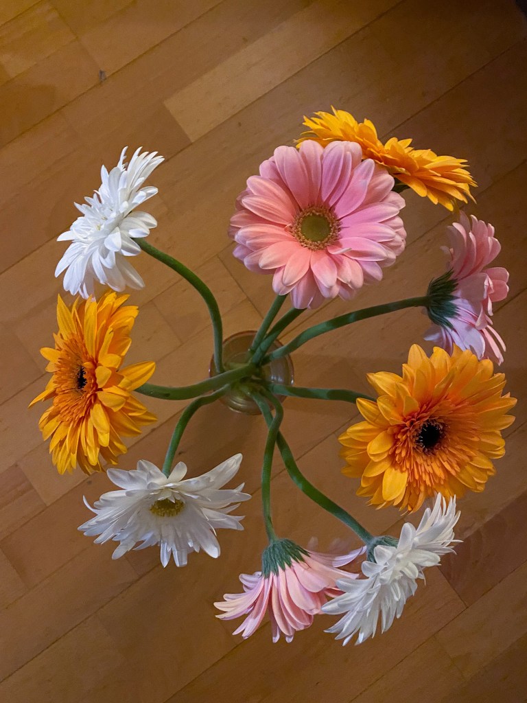 New flowers today — a bit late this week since my daffodils lasted so long. Gerbera daisies this week. A fave.