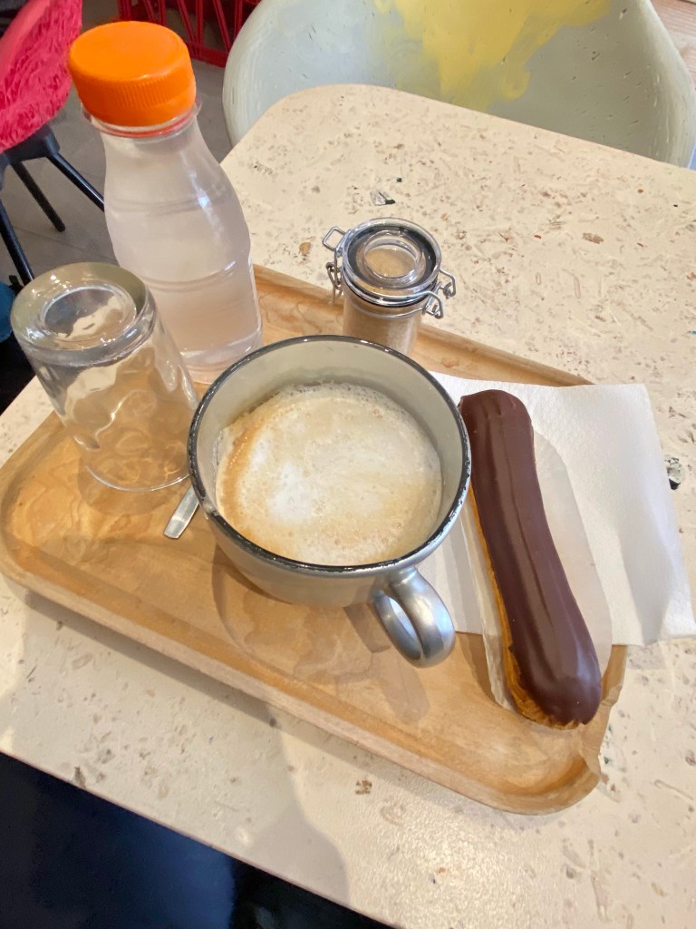 We stopped in a local café for une pause, where I enjoyed une éclaire chocolat, café crème et de l’eau.