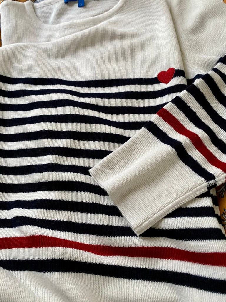 Yesterday, I went searching for the very specific French sweater (le pull) called a mariner/marinière. Yes, they really do wear them here. They’re quite popular and you’d rarely see a caricature or French stereotype wearing something else. You see them a lot – and for every season and various colors. I couldn’t find the original one I’d spotted in a storefront some weeks ago, so I headed home empty-handed. And that’s when I spotted those familiar stripes in a shop window on my very street! In fact, I found the perfect Marnière pour moi. It even has a small embroidered red heart on the left side amidst the stripes, and, one of the stripes near the bottom of the sweater — just one — is a matching red. Je l’aime! It’s otherwise navy and cream. Interestingly enough, the name of the shop was « Maille M. » And once again, I had a lovely chat with the charming saleswoman.