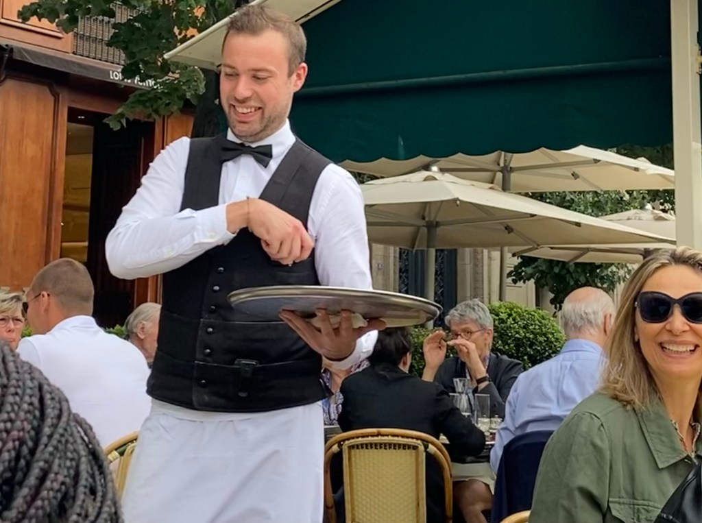 The queue for Les Deux Magots was loooooong, but I gave it barely a glance. I walked up and gave my name. I was on the list. That felt so good. Lol! I chose to sit outdoors, of course, and I was assigned a lovely seat. Even though the day called for rain, it was sunny. I enjoyed a nice lunch of Quiche Loraine, salad, and espresso. Très bien!!! I lingered, of course. I asked my waiter if he minded my taking some photos, explaining that I wanted to make paintings later. He didn’t mind at all — and in fact, he offered to pose, and I accepted! From there on, we had fun playing the roles. We joked that he would be the star of my piece of art.