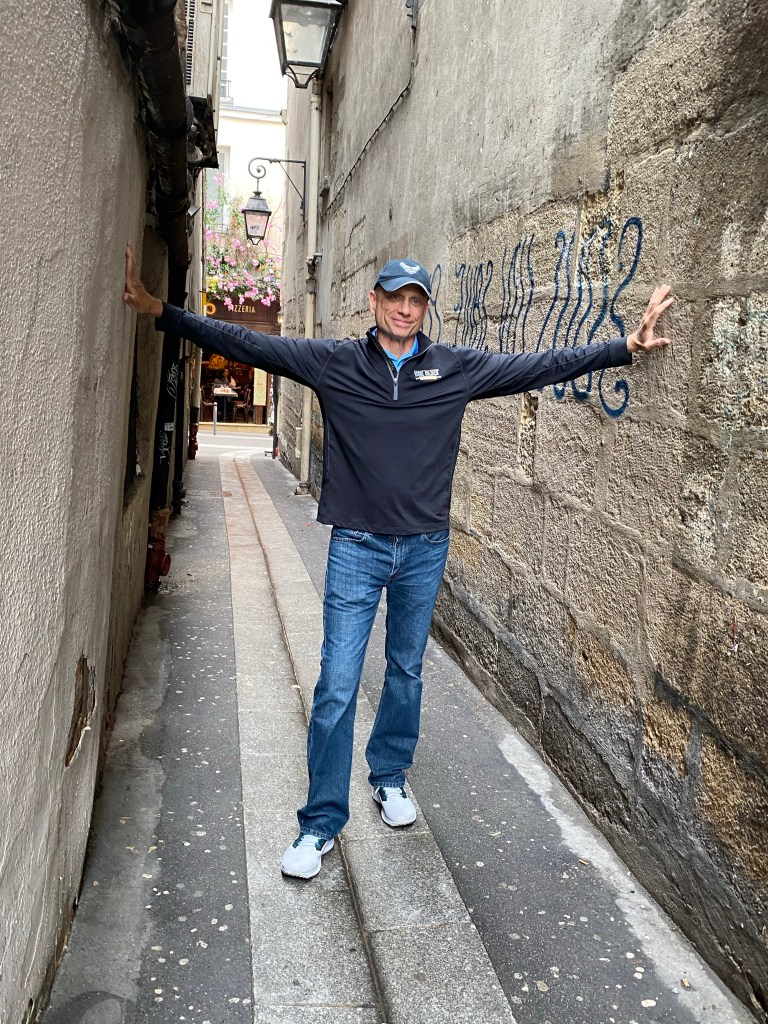 I led them down Rue du Chat qui Pêche towards the Crêpe Resto. I laugh at how I’d once SEARCHED for this tiny road, and now I knew exactly how to get there. I told Harry he had to pose for us because he’s so tall and I knew he’d be able to touch both walls, no problem. He obliged!