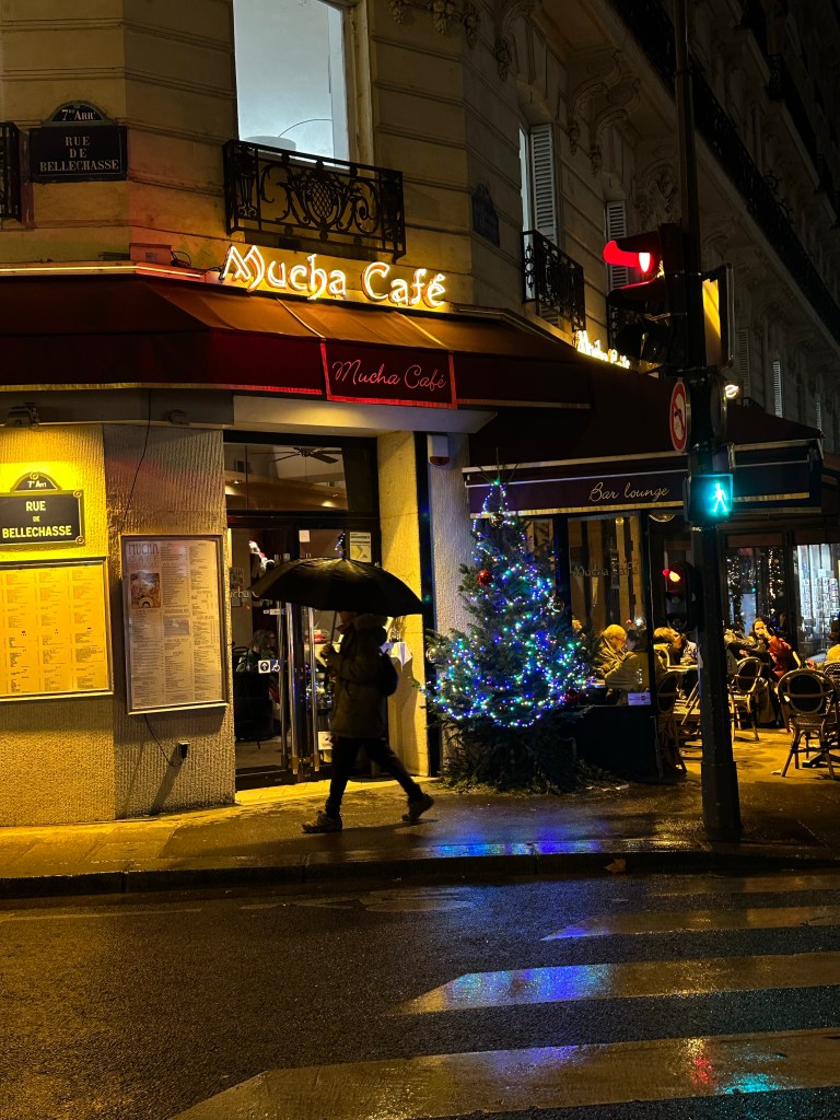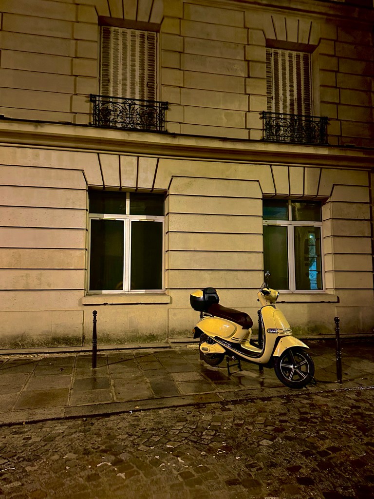There was so much more to see, but I was exhausted having been there for 5 hours, so I decided to call it a day. It was dark and I’d been there since 12:30. I made my way in the mist to le Boulevard Saint-Germain for the bus home. AS I stopped to take a few photos, the bus pulled up and people were boarding — but those doors shut and he started rolling away before I got there. I made a dash, and the driver or maybe passengers saw me, so he stopped, allowing me to board. I was relieved, and felt very Parisien in the moment.