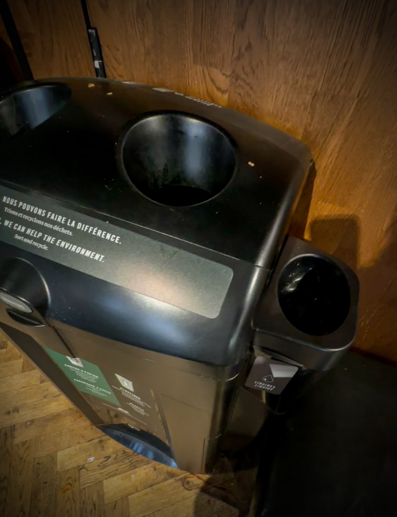 The coolest part, other than my mug, was the trash can. You heard me. I watched the other patrons for a while and was baffled by how long they took at the receptacle. They are BIG into recycling, electric buses and vehicles, scooters, bikes, etc., in Paris (France), but what was going on here, I wondered? My turn. Wow! Ok, there were two separate bins for sorting your trash/recycling — and a third bin on the side. Why? It was where you pour any remaining liquid/drink before recycling/trashing. GENIUS!
