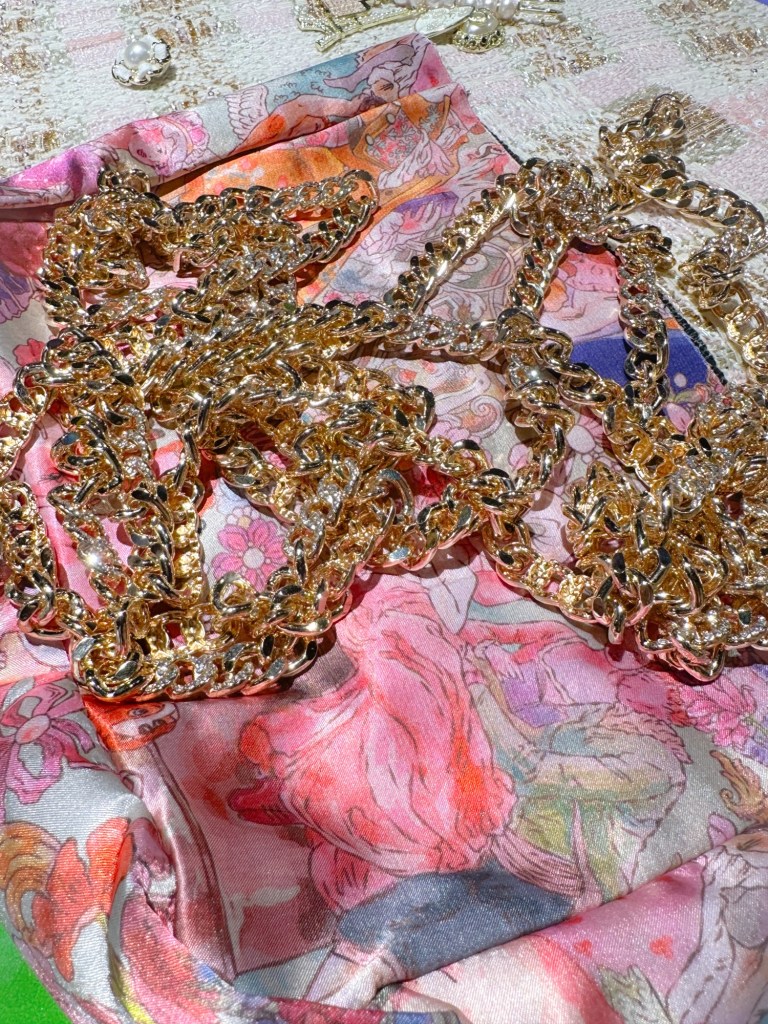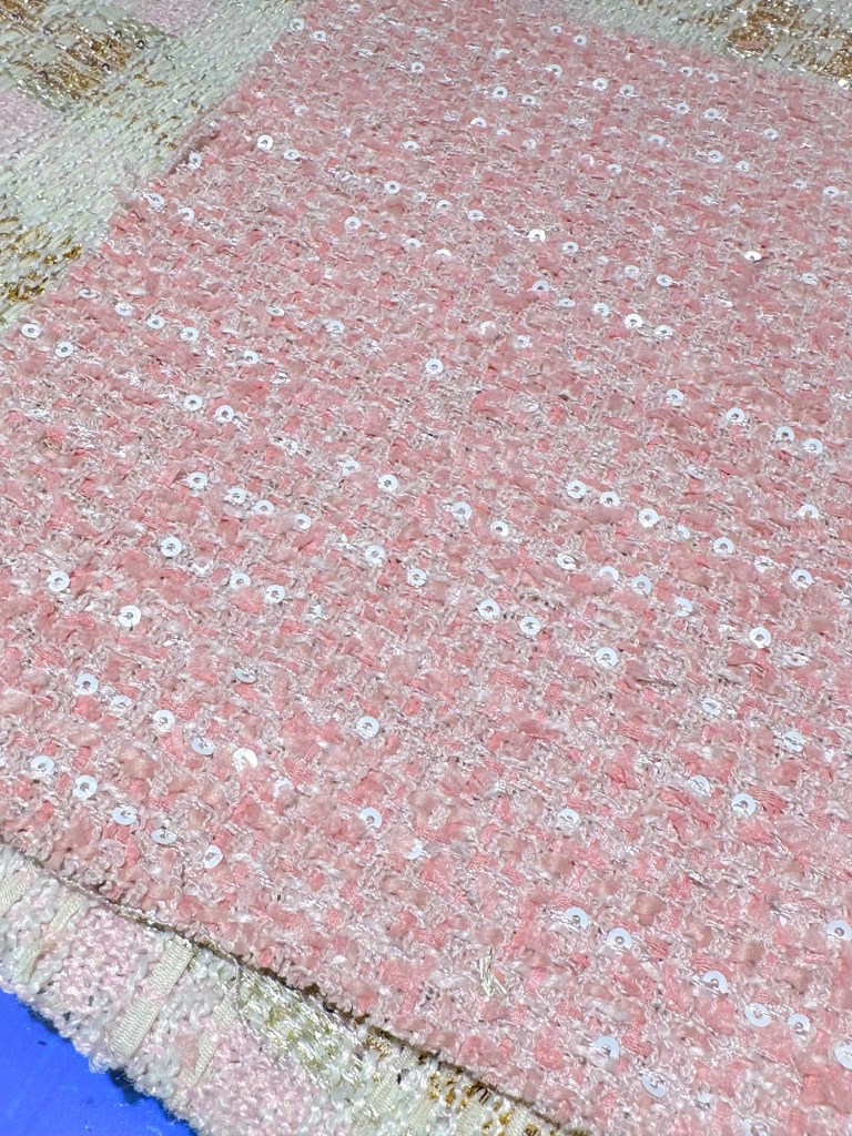 On that note, gold shoes are the “it” thing here right now. Every store has gold shoes! I think it has to do with the Olympics or something. I’m thinking medals? Silver, too, but less so. Anyway, I lost track of my story. I was going for pink and gold, with hints of cream, which I adore, and I had pulled two fabrics that fit the bill. One was pink (wool?) with tiny (!) cream sequins sewn in vertical lines. Very Chanel. The other was a cream/pink/shimmery gold plaid — the gold part is like gold tinsel, which is such a pretty color. It’s almost, but not quite, rose gold. The chain and hardware I’d selected matched that gold thread so perfectly, it made me giddy. And the chain? It has random rhinestone links, making it just a little “extra.”