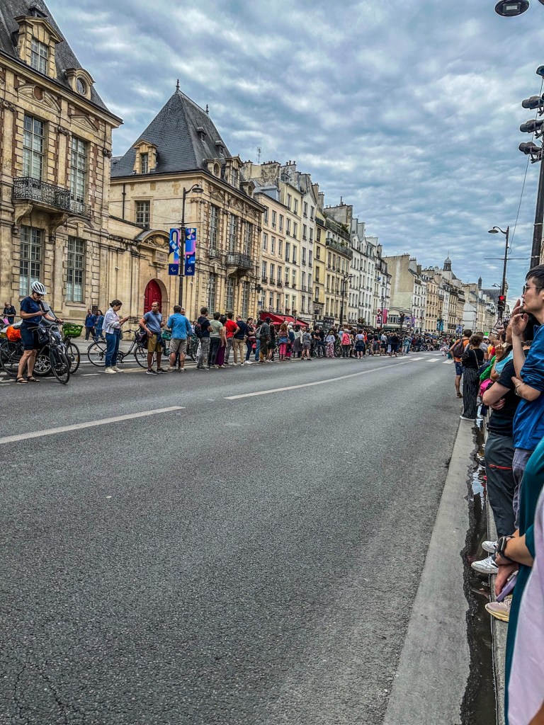I headed out, and as I turned the corner onto Rue Saint-Antoine, I saw a police presence, and the street quietly lined with Parisians waiting to catch a glimpse of La Flamme Olympique.