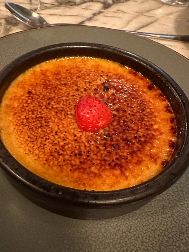 Salmon tartare, du pain, et risotto avec des crevettes et des gambas. For dessert, I enjoyed crème brûlée along with Helene, while Alicia had two scoops of vanilla ice cream served with la tarte tatin – which is very traditional, and also fun to say!