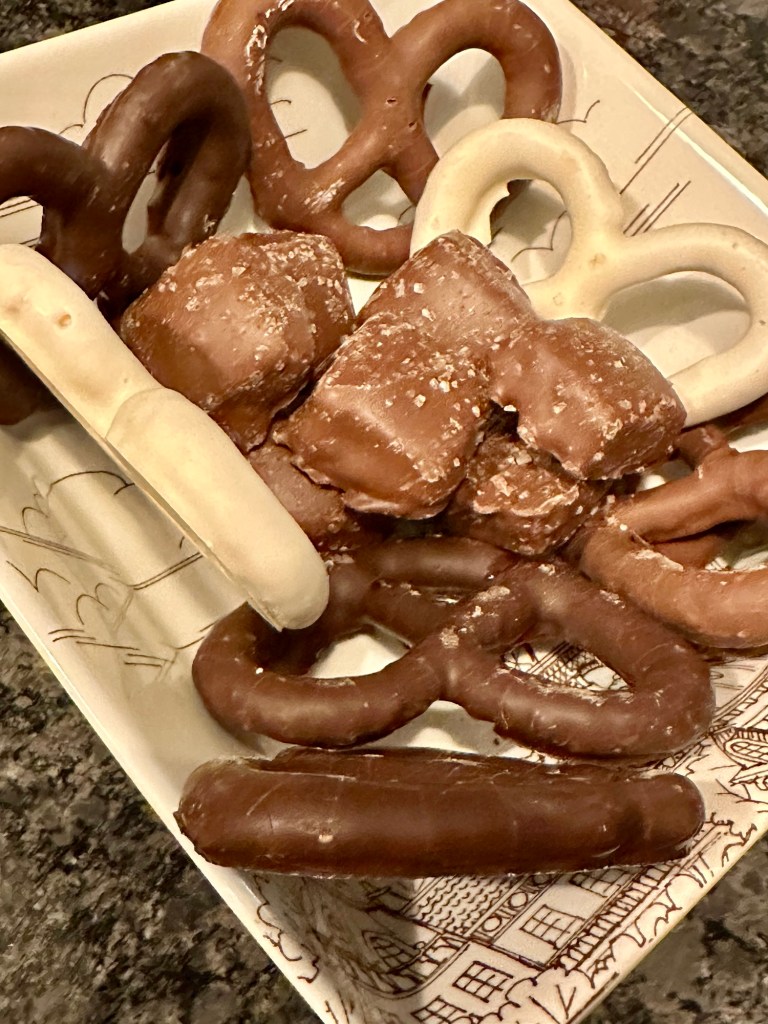 Fruits, and chocolate-covered pretzels, and roses, a card, PROSECCO, of course. (Always the bubbly!)