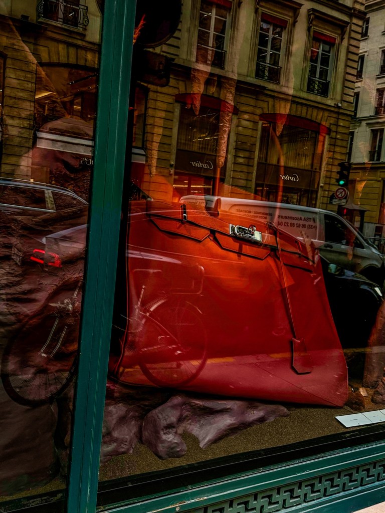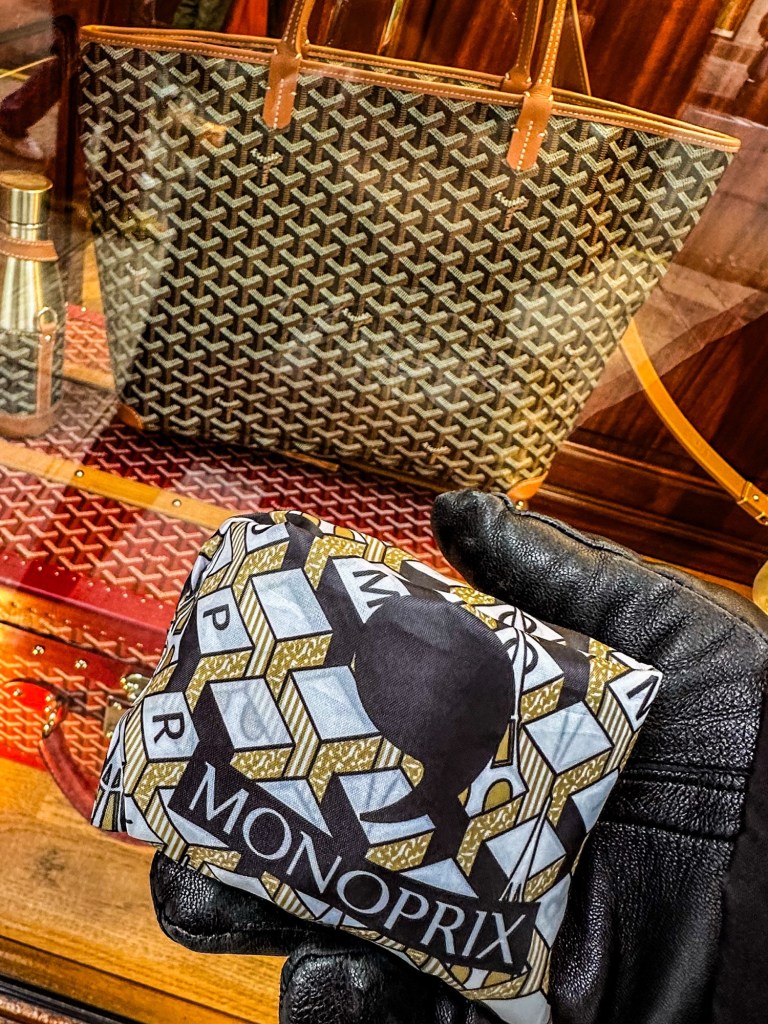 We pass in front of the storefront, and I stop him from talking, saying, “This can’t be a coincidence…” I think this was Goyard (he is on both side of the street, across from one another), but when I saw this leather tote, I pulled out my Monoprix nylon expandable bag. He gasped and we both took photos!