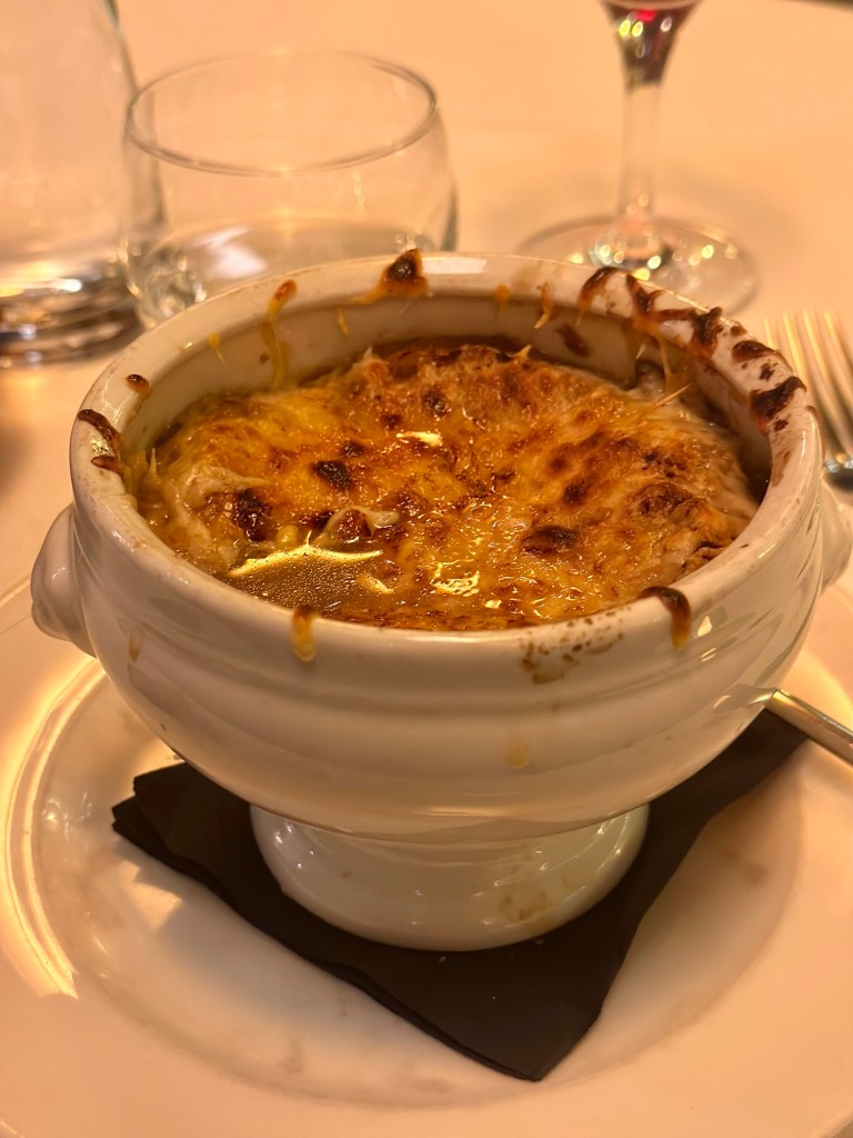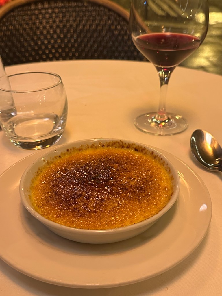 I just wanted something hearty, but not too much.started with les escargots, and a basket of bread. My second course was a nice bowl of soup a l’oignon. I enjoyed dipping the bread into everything and washing it all down with a glass (or two) of red. It was cold! Dessert was crème brûlée of course, because hello, I am in Paris, and I wanted all the traditional foods tonight to warm my soul.